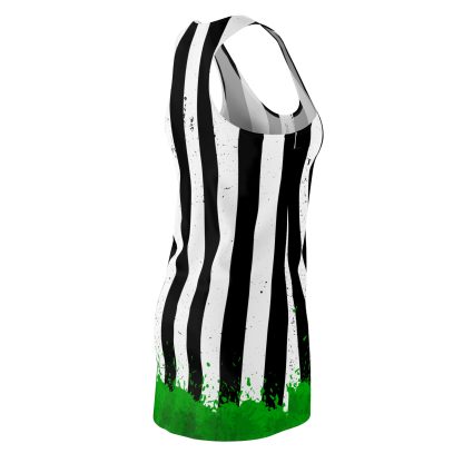Step into the spotlight with the Ghost With The Most Racerback Dress, a stunning homage to the iconic Beetlejuice suit that effortlessly combines classic gothic charm with contemporary style. This black racerback dress is expertly crafted to channel the quirky, memorable essence of Tim Burton’s beloved character, featuring subtle yet bold black and white pinstripes that echo Beetlejuice’s unmistakable look. The dress is given a unique twist with a captivating green splatter effect near the hem, injecting a splash of signature Beetlejuice green that adds a playful, edgy flair.